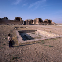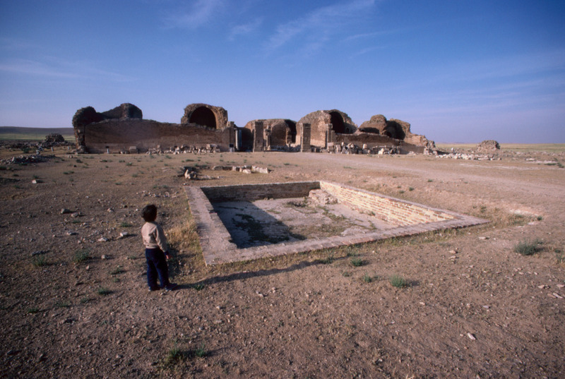 Jordan. Qasr al-Mushatta, within the walls of Mushatta, a small pool and the standing remains of the triple-apsed throne room and adjacent rooms