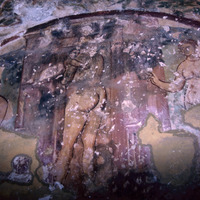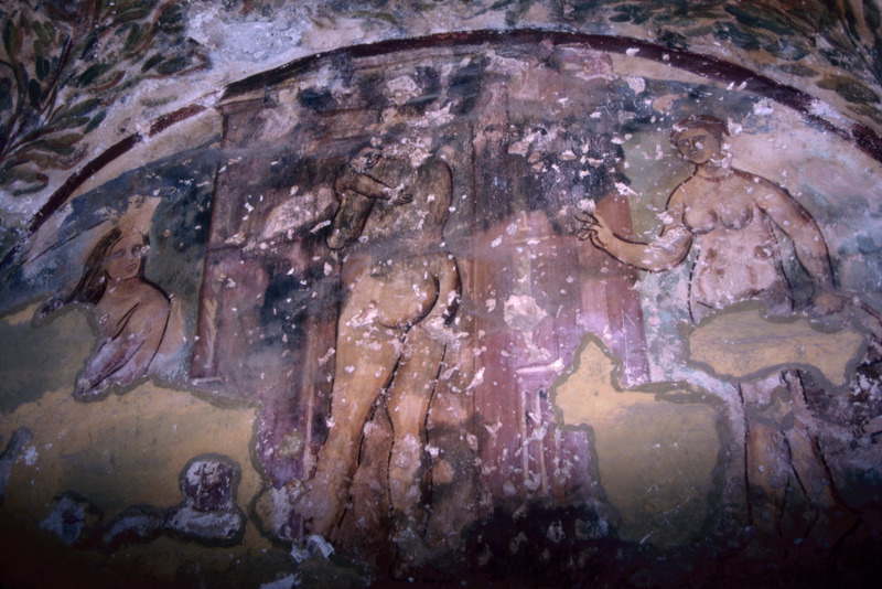 Jordan. Qusayr Amra, bathing scene with three female figures on an architectural background, the one on the right is approaching with a large vessel of hot water, while the one in the center holds a child