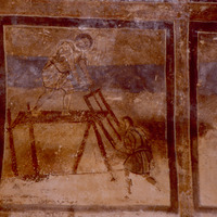 مشهدان لحرفة النجارة والبناء ، يظهر صورة عاملات ينشران لوحاً من الخشب