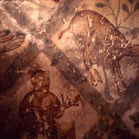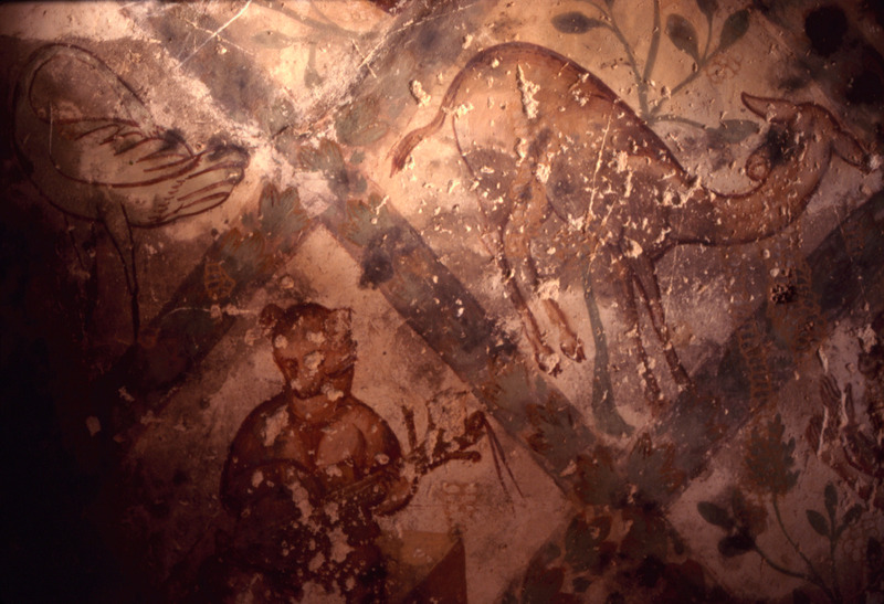 Jordan. Qusayr Amra, a gazelle sniffing. and a bear is playing a three-stringed lute - مشهد لغزال تشتم ، ومشهد لدب يعزف على عود ذي ثلاثة أوتار