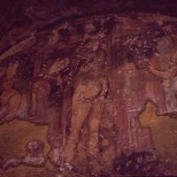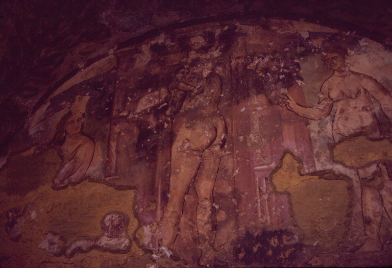Jordan. Qusayr Amra, bathing scene with three female figures on an architectural background, the one on the right is approaching with a large vessel of hot water, while the one in the center holds a child