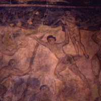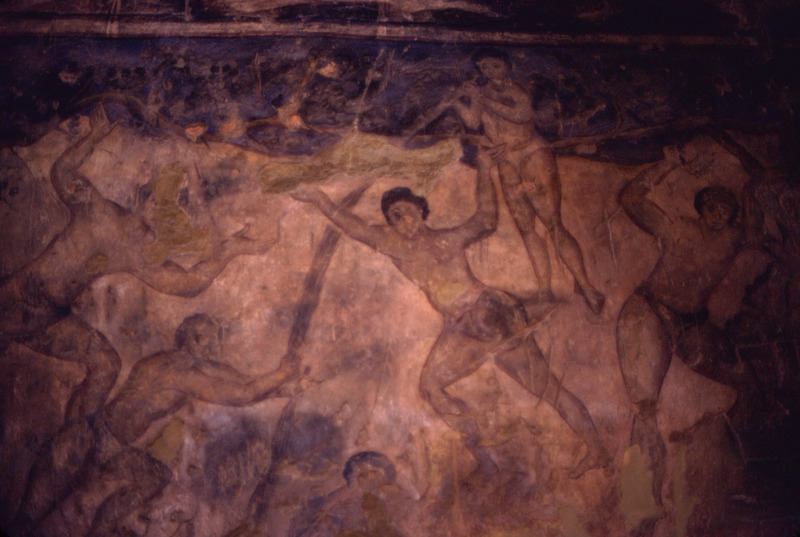 Jordan. Qusayr Amra, is an arena scene in which the caliph appears, performing in the gymnastic combats depicted as a symbol of power