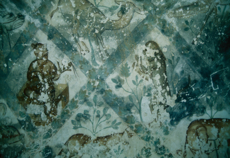 Jordan. Qusayr Amra, a gazelle sniffing. and a bear is playing a three-stringed lute - مشهد لغزال تشتم ، ومشهد لدب يعزف على عود ذي ثلاثة أوتار