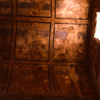 Jordan. Qusayr Amra, general view of the vault of the left bay, with artisan scenes. On the upper part, the decorative arrangement of the soffit of the arch which leads into this aisle may be observed, with the female figures holding a medallion