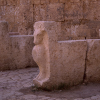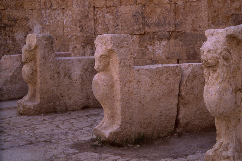 Jordan. Jerash, Macellum (Agora), mensa legs decorated with lions and in high relief inserted in a Byzantine structure