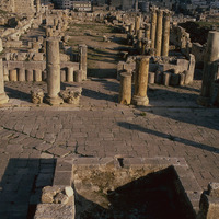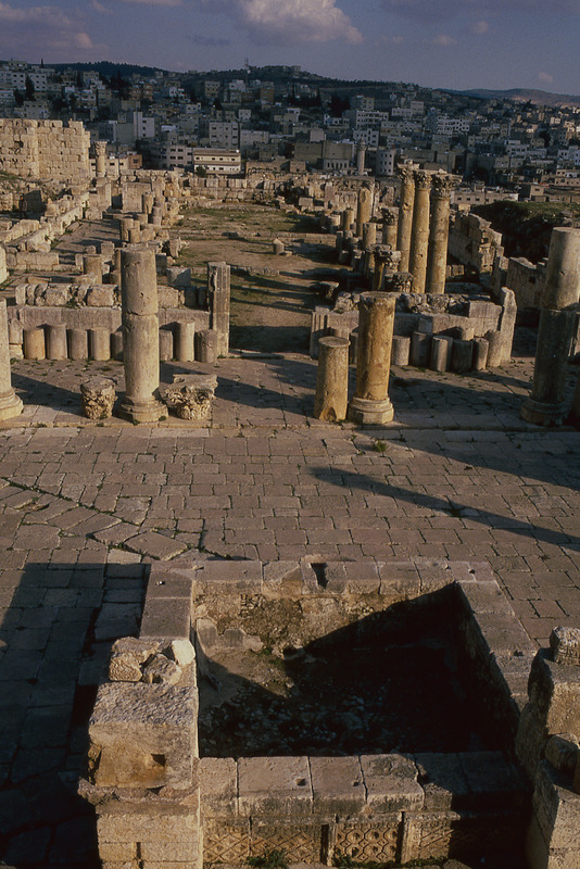 Jordan. Jerash, The Fountain Court with the ruins of the Cathedral