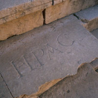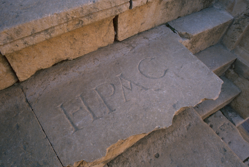 Jordan. Jerash, North theater seating, inscription, Greek