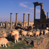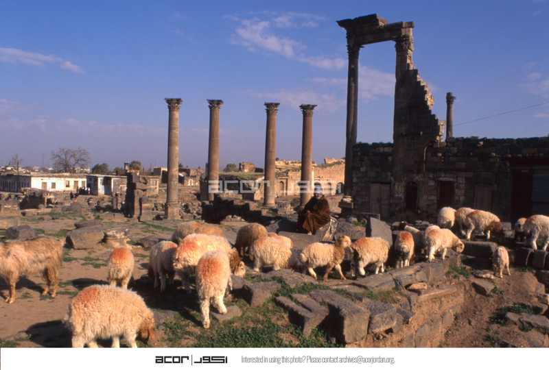 Syria. Bosra, women and sheep, four columns of nymphaeum