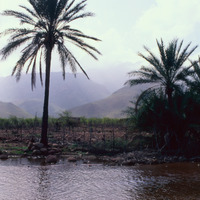 Yemen. Socotra, palm-fringed river, mountains in background