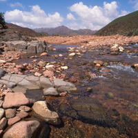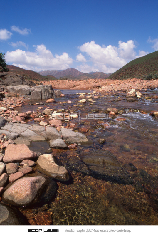 Yemen. Socotra, stream with granite mountains in background