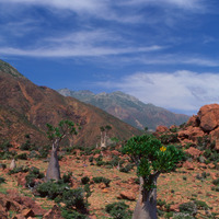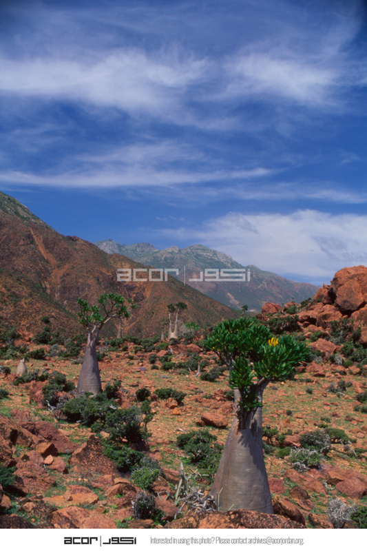 Yemen. Socotra, bottle trees (Adenium socotranum) and granite mountains