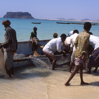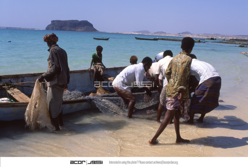 Yemen. Bir Ali fishermen, Husn al-Ghurab behind