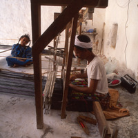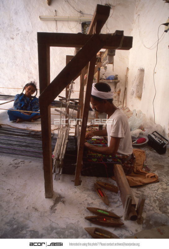 Yemen. Ash-Shihr, weaver working at pit loom