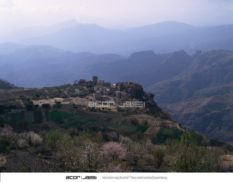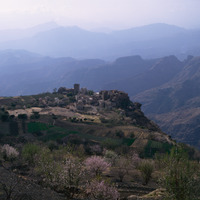 Yemen. Village, terraces and blossom near Jabal Nabi Shu'ayb