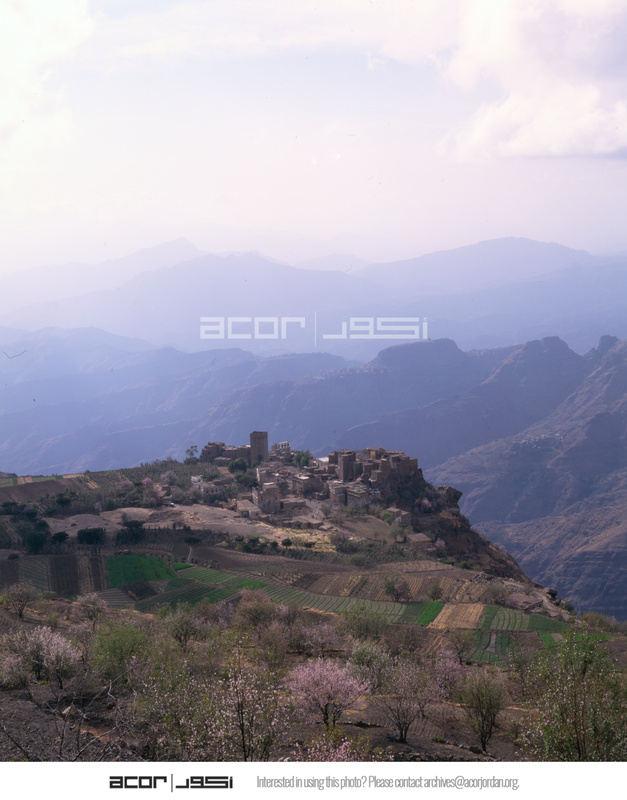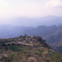 Yemen. Village, terraces and blossom near Jabal Nabi Shu'ayb