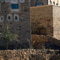 Yemen. Shaharah houses and women carrying water