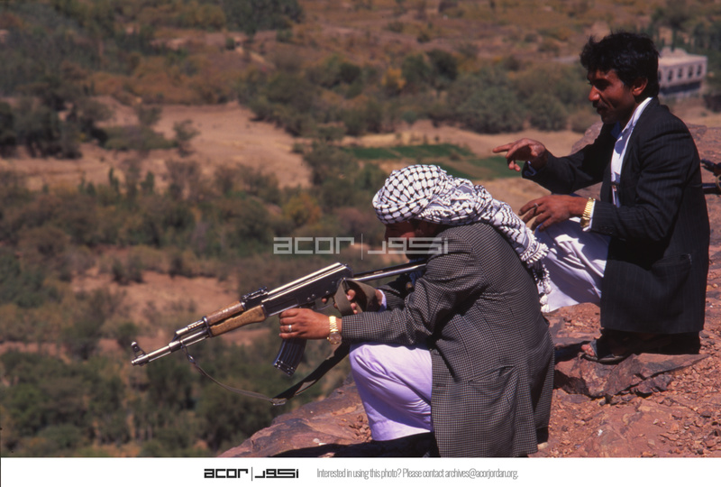Yemen. Wadi Dhahr near Sana'a, wedding gusts firing guns