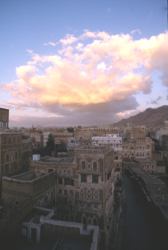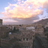 Yemen. Sana'a, sunset clouds and houses