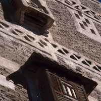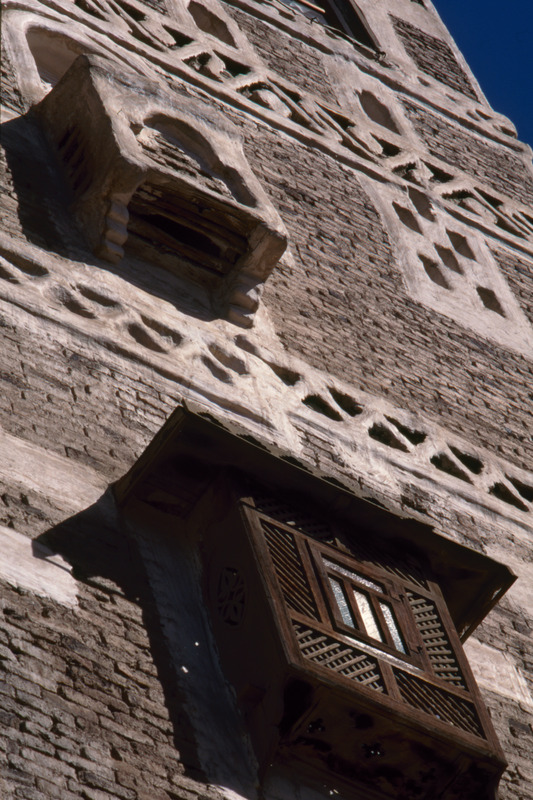 Yemen. Sana'a, detail of house façade with two types of shubbak (windows)