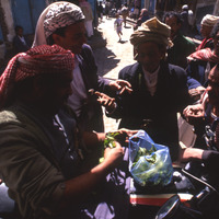 Yemen. Sana'a, Qat purchase on motorbike in souq