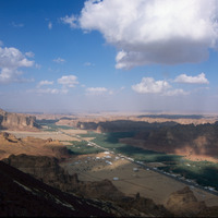 Saudi Arabia. Al-Ula, view north over wadi and mountains from Jabal Harra