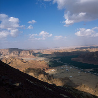 Saudi Arabia. Al-Ula, view north over wadi and mountains from Jabal Harra