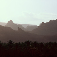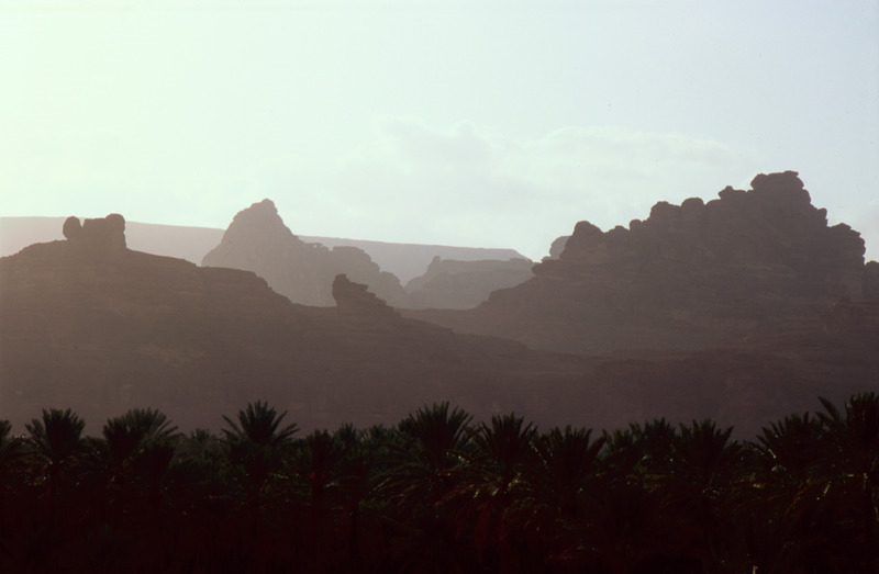 Saudi Arabia. Al-Ula, palm trees and mountains in evening