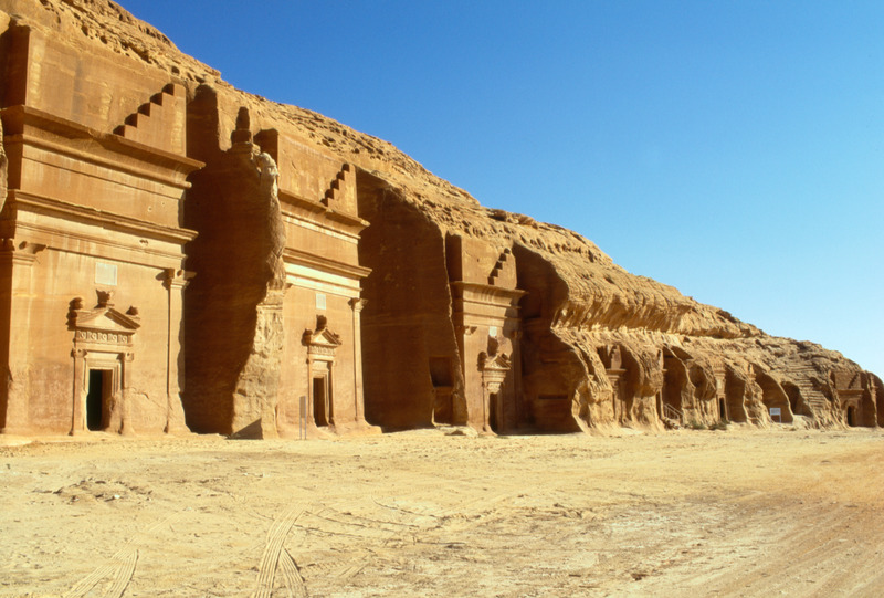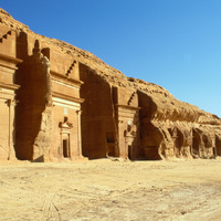 Saudi Arabia. Mada'in Saleh, Qasr al-Bint, tombs on west side (Tomb 23 on left)