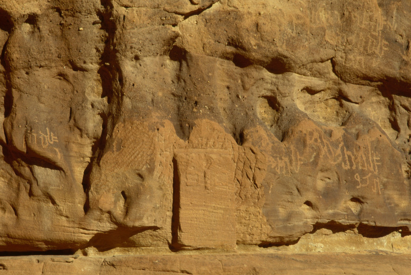 Saudi Arabia. Mada'in Saleh, Jabal Ethlib, 'eye' idol and Nabataean inscription