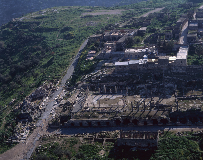 Umm Qais (Gadara), Basilica terrace, Nymphaeum and Ottoman village, from west