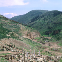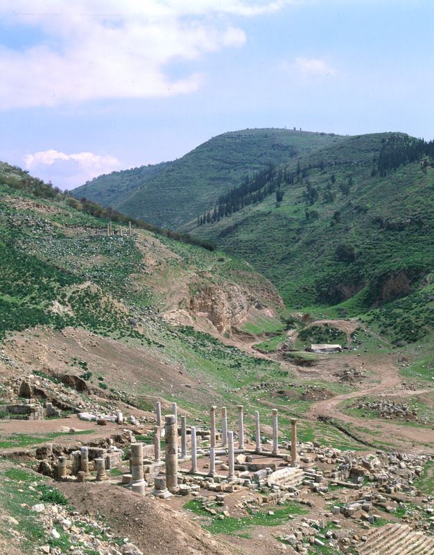 Pella (Tabaqat Fahl), view from main mound to Wadi Jirm, showing Byzantine Civic Complex Church, monumental stairs and odeon, with east church on hill above