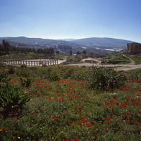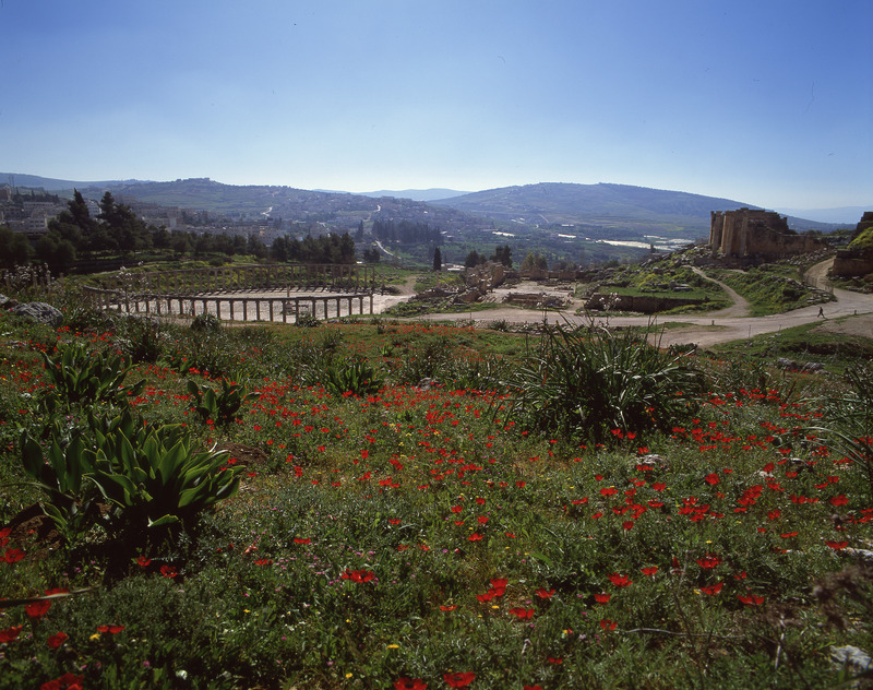 Jordan. Jerash, wild flowers, Oval Piazza and Temple of Zeus
