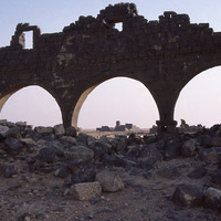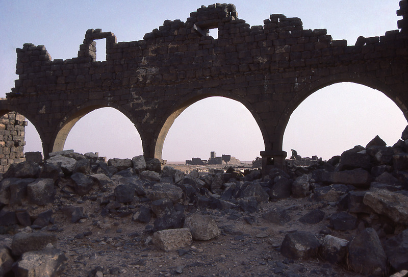 Umm al-Jimal, barracks seen through arch of west church