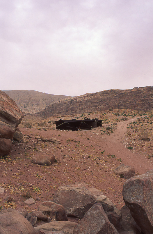 Petra, bedouin tent from outside, Petra behind