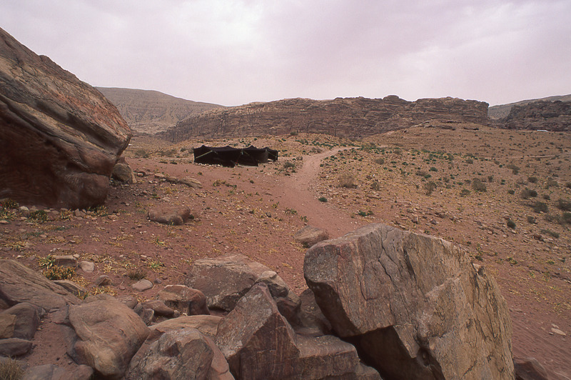 Petra, bedouin tent from outside, Petra behind