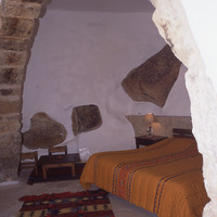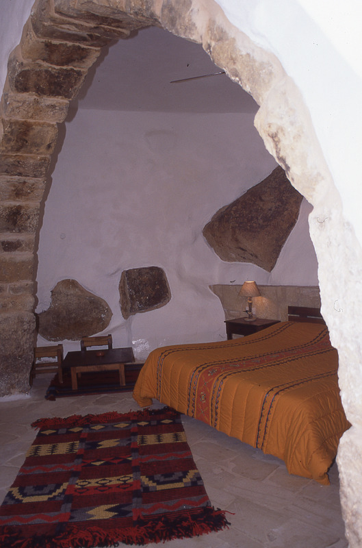 Taybeh village, Taybet Zaman Hotel, bedroom interior and boulders