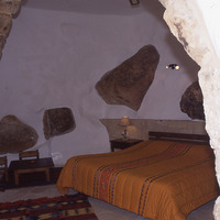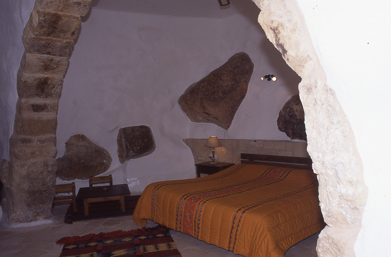Taybeh village, Taybet Zaman Hotel, bedroom interior and boulders