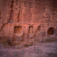 Petra, relief of Isis and other niches , cistern and Nabataean inscriptions of Wadi as Siyyagh