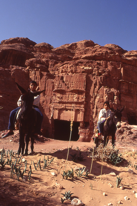 Petra, Turkmaniyya Tomb and bedouin boys on donkeys