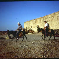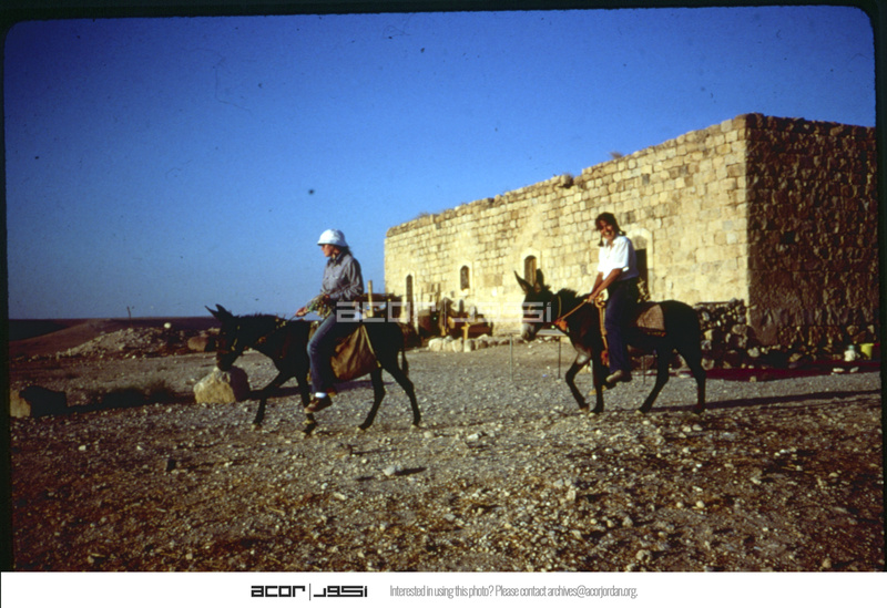 اللجون- موسم حفريات 1980، عضو في الفريق يركب حمارًا أمام مبنى الجيش العثماني يعود بناءه لعام 1910 (الذي تحول لاحقًا إلى مدرسة)