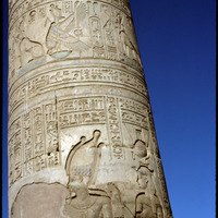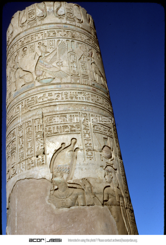 تفاصيل النقوش والكتابات الهيروغليفية على عمود بفناء معبد كوم أمب