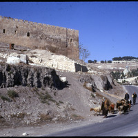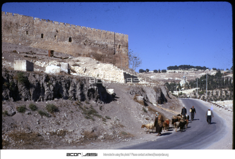 سور مدينة القدس، الزاوية الجنوبية الشرقية، مع ظهور الرعاة والقطيع بالطريق