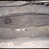 مشروع أعمال التنقيب الأثري في موقع الحميمة - الكنيسة السفلية ، قبر فيه بقايا هيكل عظمي