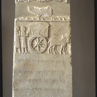 شاهد حيثي عليه نقش بارز لثيران تحمل قبرًا مع كتابات منقوشة