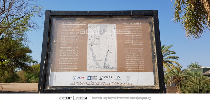 العقبة. آيلة، لوحة تفسيرية في مدينة آيلة الأثرية تم تركيبها بدعم من المركز الأمريكي للأبحاث من خلال مشروع استدامة الإرث الثقافي بمشاركة المجتمعات المحلية