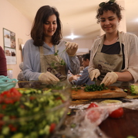 الأردن. غور الصافي، فريق المركز الأمريكي للأبحاث وأعضاء من فريق مشروع استدامة الإرث الثقافي بمشاركة المجتمعات المحلية والوكالة الأمريكية للتنمية الدولية في زيارتهم إلى مطبخ الصافي لتجربة مجموعة من تجارب السياحة الزراعية