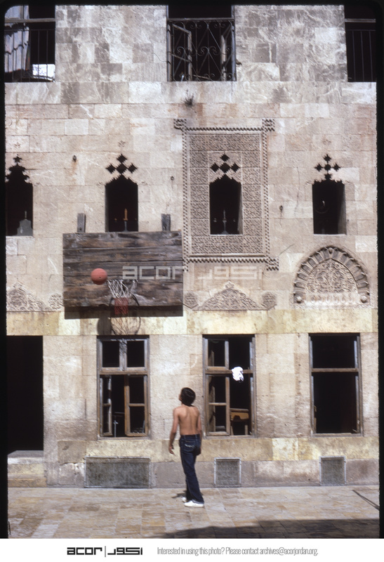 طفل يلعب كرة السلة في ساحة بيت غزالة الداخلية في حي الجديدة