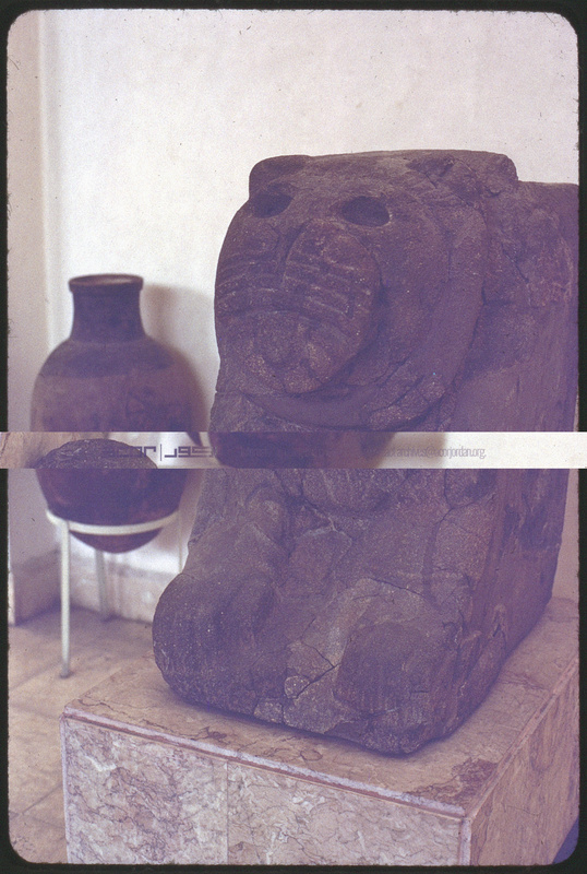 تمثال أسد وبجانبه فخار في متحف حلب الوطني