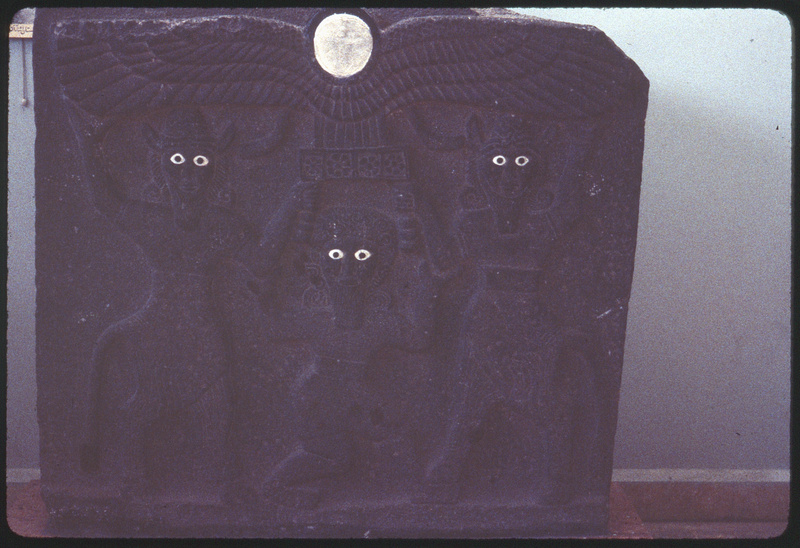 نقش يصوّر جلجامش بين اثنين من أنصاف الآلهة يرفعان شعار إله الشمس من تل حلف في متحف حلب الوطني