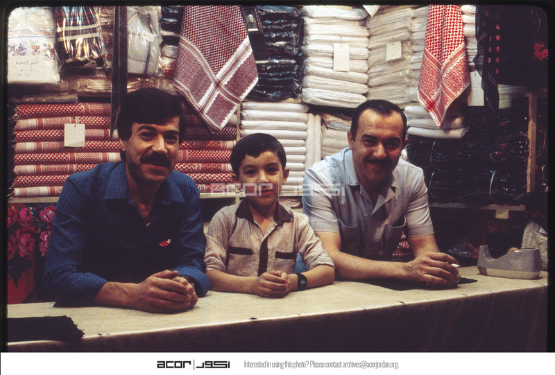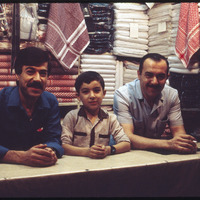 رجلان وطفل في محل بيع الأقمشة في أحد أسواق حلب القديمة